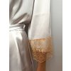 Luxusní župan z přírodního italského saténu se zlatou krajkou z Emirátů je dokonalou kombinací elegance a pohodlí. Jemný, lehký a prodyšný materiál působí hedvábně na pokožce a zajišťuje maximální komfort při nošení. Kvalitní přírodní satén z Itálie dodává županu sofistikovaný lesk a luxusní vzhled, zatímco zdobená zlatá krajka podtrhuje jeho jedinečnost a smyslnost. Tento exkluzivní kousek nejen krásně padne, ale také zvýrazní ženskost a eleganci. Ideální volba pro chvíle odpočinku i výjimečné okamžiky, ve kterých se budete cítit krásná a sebevědomá.